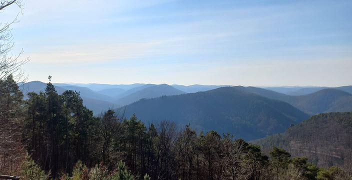Unsere Rast machen wir an der Jung-Pfalz-Hütte, bevor wir zum Abschluss noch den Krappenfels erreichen. Von dort genießen wir einen herrlichen Blick auf Annweiler am Trifels und die umliegenden Burgen.